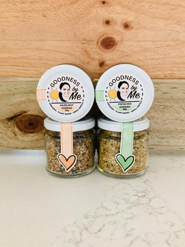 Hand made in a Mortar and Pestle both the Hazelnut and Pistachio Dukkah's ingredients are carefully roasted to bring out the very best flavours and aromas and then pounded with care and attention.